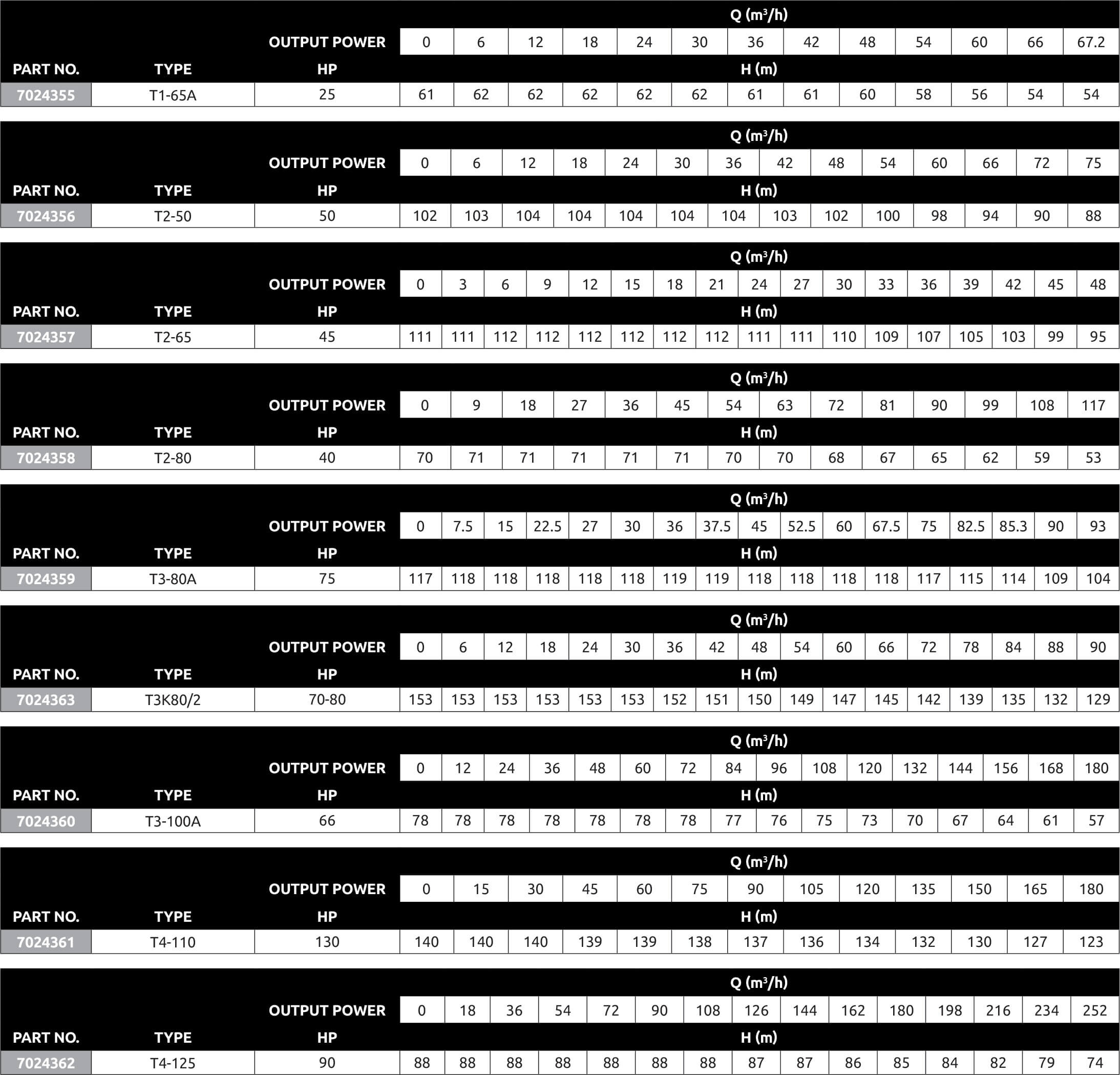 De traktordrevne pumper type T leveres monteret med "E" pumpehjulet, hvilket giver det højeste tryk. For forskellige løbehjulstyper bedes du kontakte os.