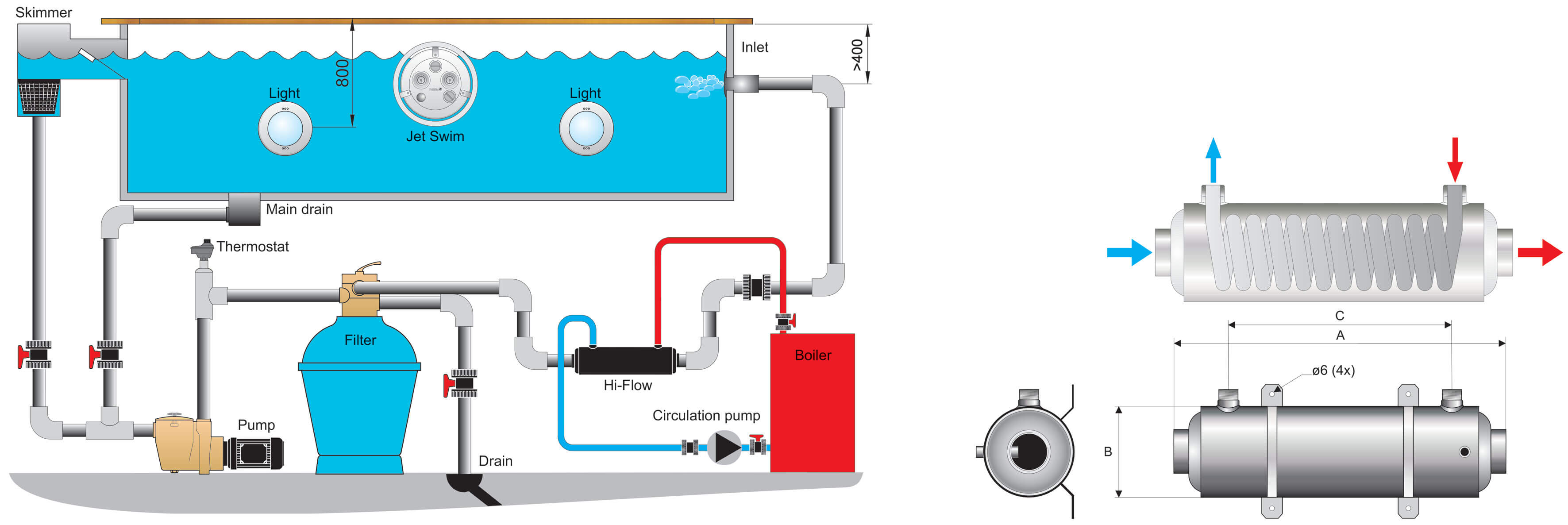 Hi-Flow er en velafprøvet og testet varmeveksler med effektive varmeoverførselsfunktioner. Den er beregnet til swimmingpools og andre applikationer, hvor der er behov for høj kapacitet sammen med en lavtryksfald. Alle modeller kan installeres sammen med kedler, varmepumper, solpaneler eller andre varmekilder. Disse varmevekslere er lette og kompakte. Det materiale, der anvendes – syrefast rustfrit stål AISI 316 - er valgt med henblik på arbejdsforhold, hvor der er en risiko for korrosion. Justerbare beslag i rustfrit stål medfølger. Velegnet til klorbaserede pools. Kun vandret montering.