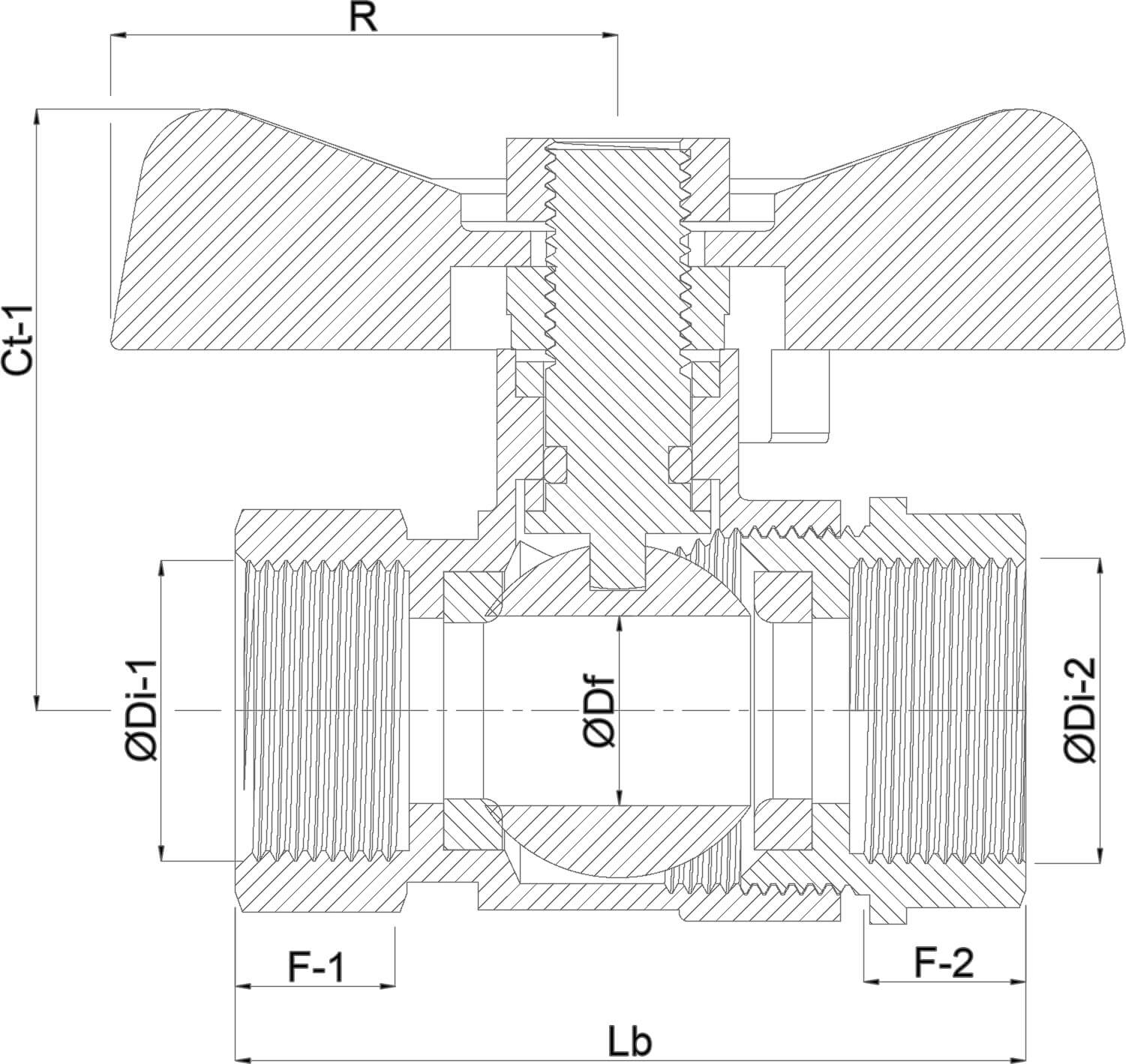 Dieser Kugelhahn hat einen Innengewindeanschluss und ist für Gas geeignet. Das Gehäuse ist aus vernickeltem Messing, der Schmetterlingsgriff aus Stahl.