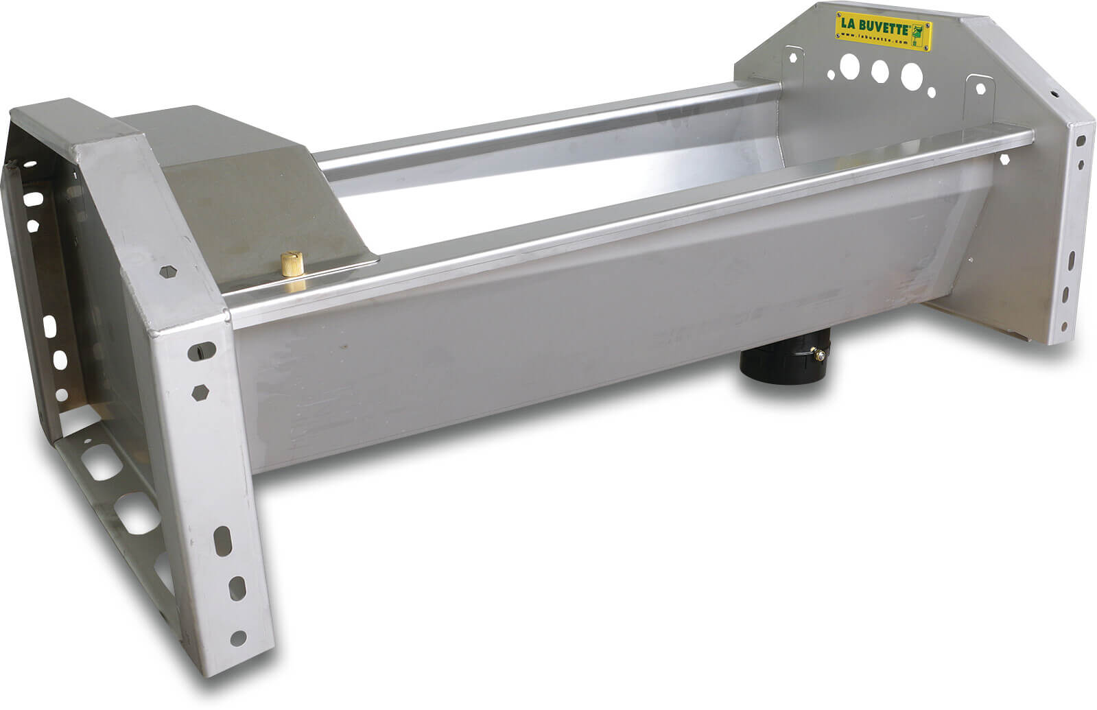 - Stainless steel trough of 57 litres linking sturdiness and food safety. With slanted bottom for easier cleaning and specially folded non-spill edge to minimize water loss and avoid splashing. Only 105 cm long: can easily be installed instead of a cubicle or between two rows of cubicles.