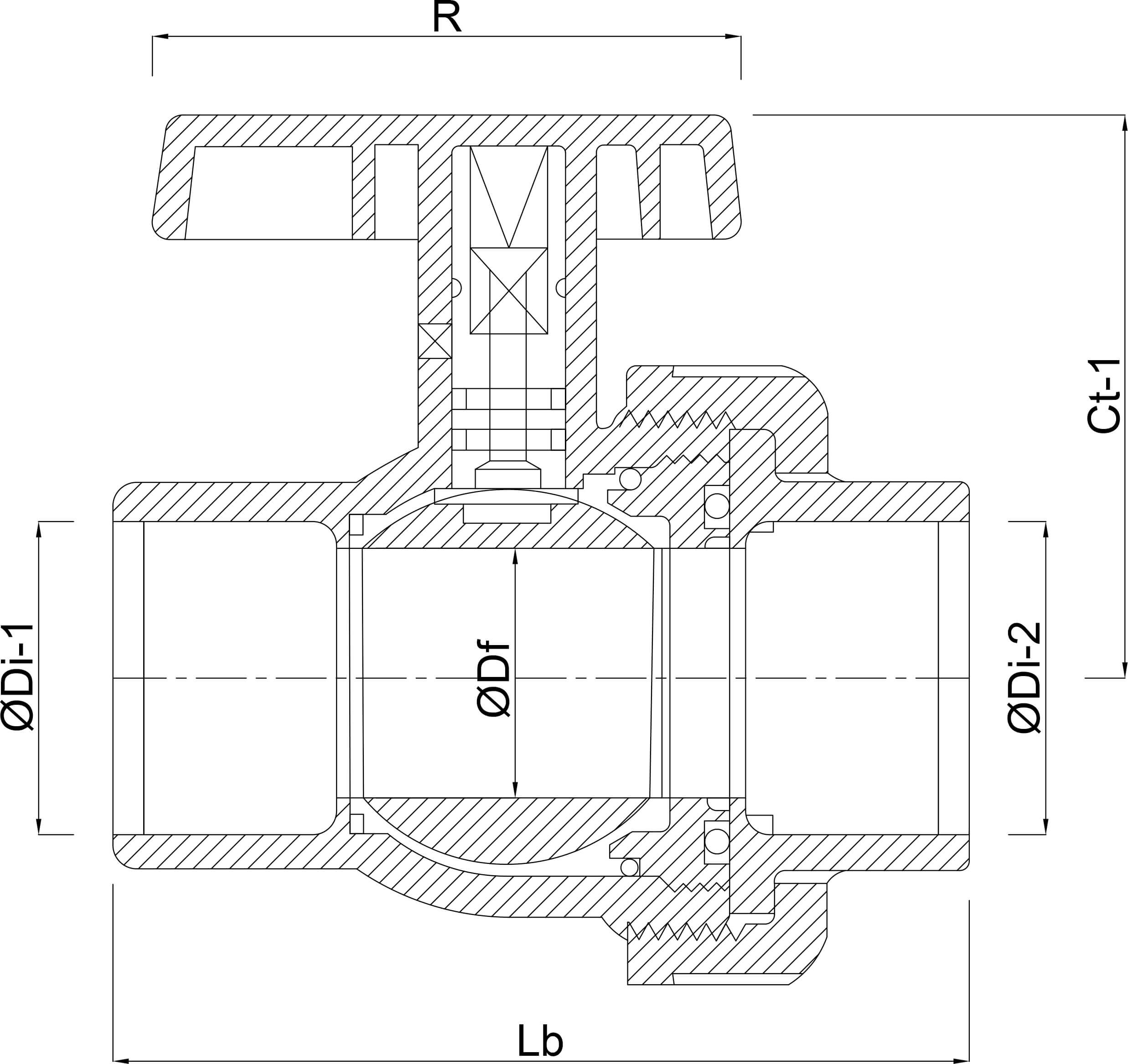 The PVC-U made VDL Ball valve with single union, type EIL viton, flush out secured, has a glue socket connection and works at a pressure of 16 bar. Seals: Teflon filled PE/Viton. The valve is available in a wide range of sizes.