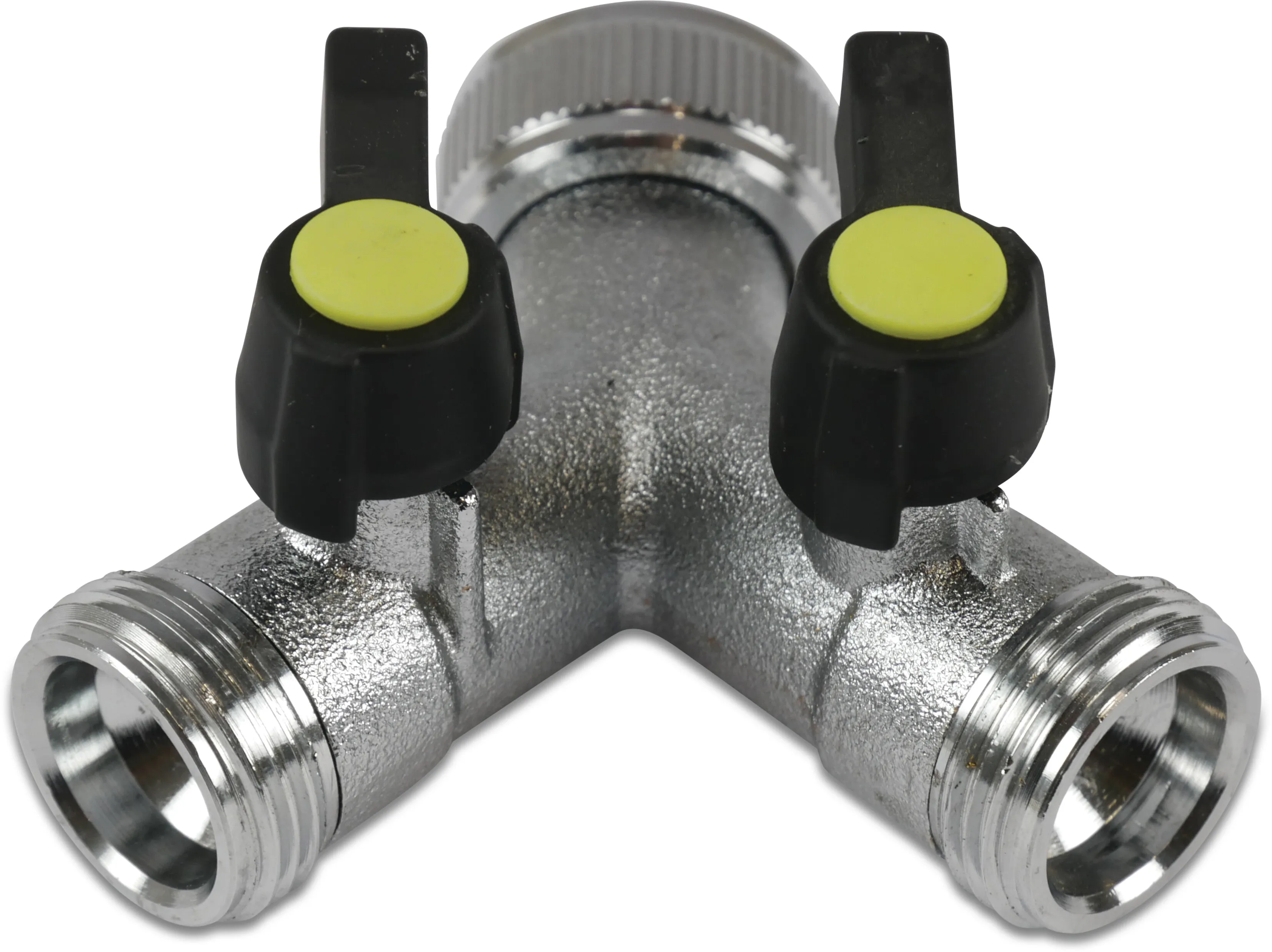 3-drożny zawór Hydro-S, typu z 2 dźwigniami zamykającymi to mosiężna mufa/złącze typu "klik" , stosowane głównie w gospodarstwie domowym (zrób-to-sam). Element posiada nakrętkę z gwintem wewnętrznym x gwint zewnętrzny x Połączenie zewnętrzne.